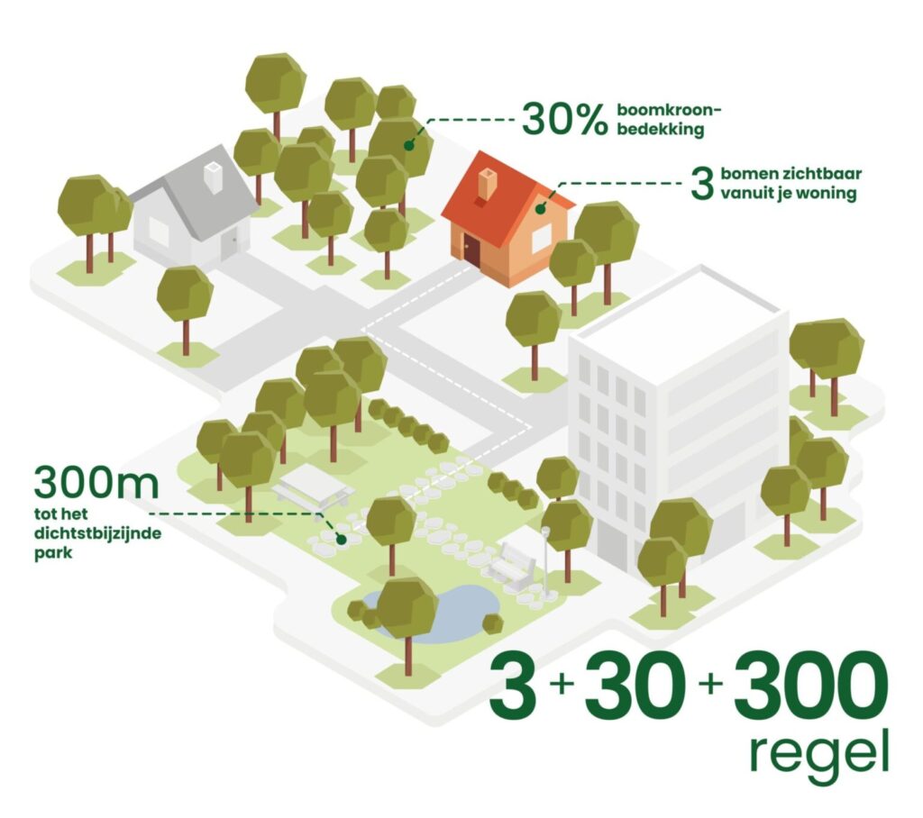 - We stoppen de verstening en voeren ambitieus groenbeleid met de 3-30-300 regel: drie bomen zichtbaar vanuit elke woning, dertig procent bladerdek per buurt en op maximaal driehonderd meter van iedere woning een park of natuurgebied.